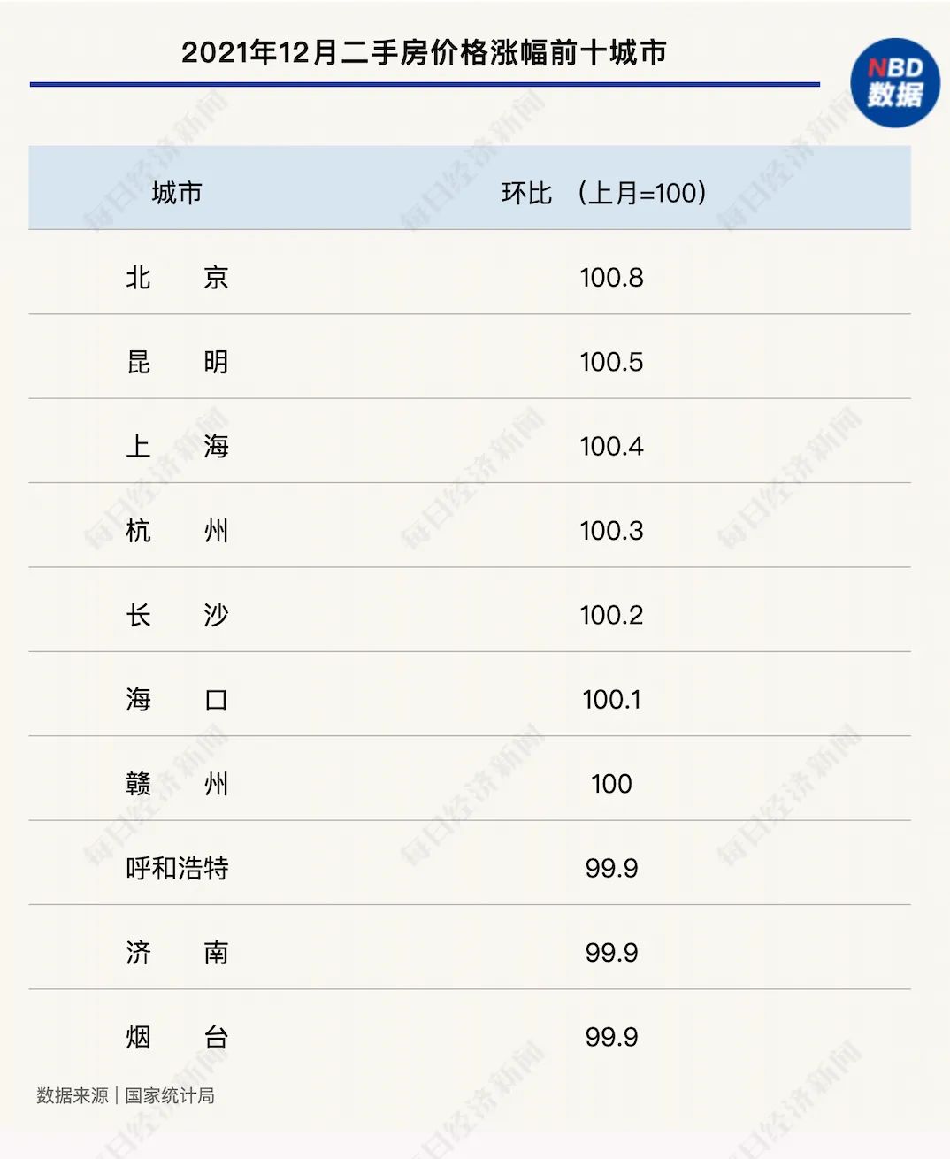 作为市场的晴雨表,二手房价格变动趋势更直观反映了市场情绪。国家统计数据显示,2021年12月份,仅有北京、昆明、上海、杭州、长沙、海口等6个城市二手房价格环比上涨。除赣州持平外,63个城市环比不同程度下跌。