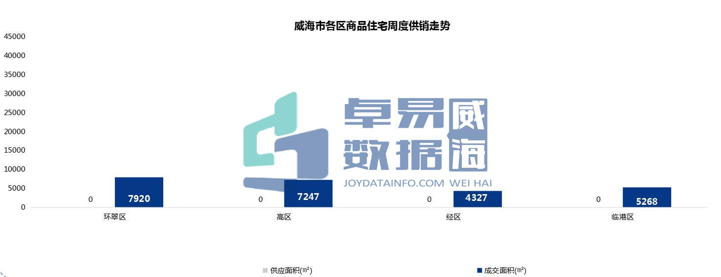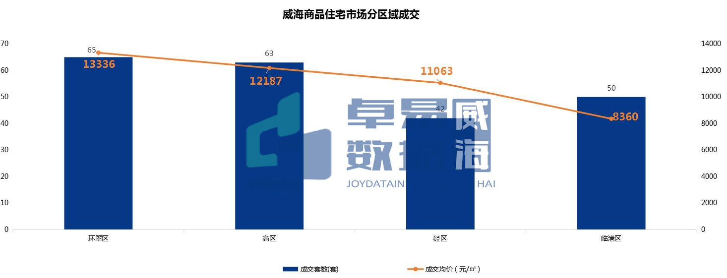 从区域来看,本周威海环翠区在成交面积、套数和均价方面高于其他三个区,成交65套,占比30%,成交面积7920㎡,均价13336元/平;