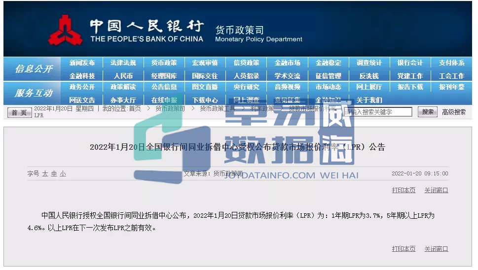 中国人民银行授权全国银行间同业拆借中心公布,2022年1月20日贷款市场报价利率(LPR)为:1年期LPR为3.7%,5年期以上LPR为4.6%。以上LPR在下一次发布LPR之前有效。