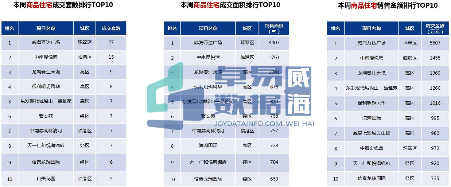 本周项目成交TOP10各区分散成交,环翠区威海万达广场项目在成交套数、成交面积、成交总金额排行榜上均位列排名前列。临港区中南漫悦湾项目、高区龙湖春江天境项目均在三个成交榜单中分列二、三席。