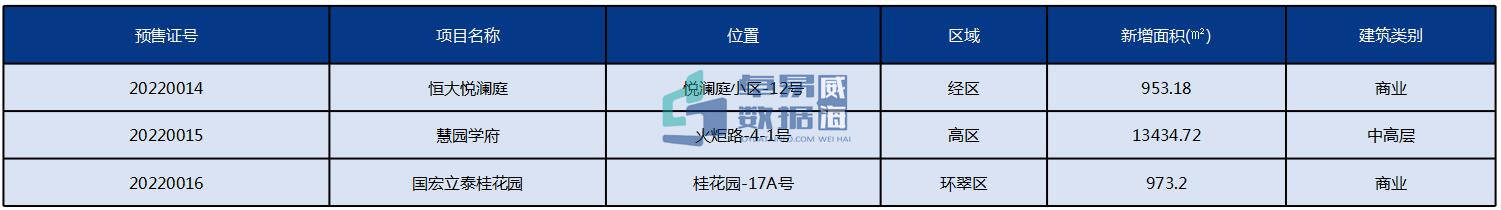 据卓易监测数据显示,本周威海市住房和城乡建设局仅更新了3张预售证,涉及经区恒大悦澜庭、高区慧园学府和环翠区国宏立泰桂花园3个项目,总建面约15361.1㎡。