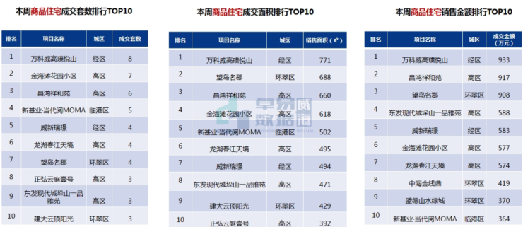 本周成交top10分布较为分散,其中万科威高璞悦山位列成交套数、面积、金额TOP1