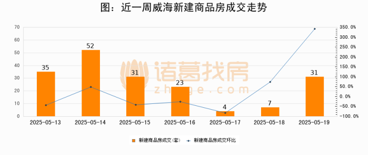根据威海市住房和城乡建设局数据显示,2025年05月19日威海新建商品房成交31套,较昨日增加24套,环比上涨342.9%。近一周威海新建商品房日均成交27套。05月19日单日成交31套,高于近一周平均水平14.8%。