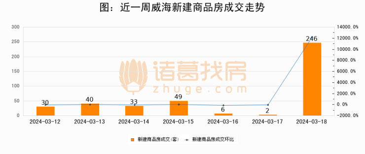 根据威海市住房和城乡建设局数据显示,2024年03月18日威海新建商品房成交246套,较昨日增加244套,环比上涨12200%