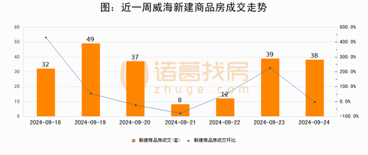 根据威海市住房和城乡建设局数据显示,2024年09月24日威海新建商品房成交38套,较昨日减少1套,环比下降2.6%