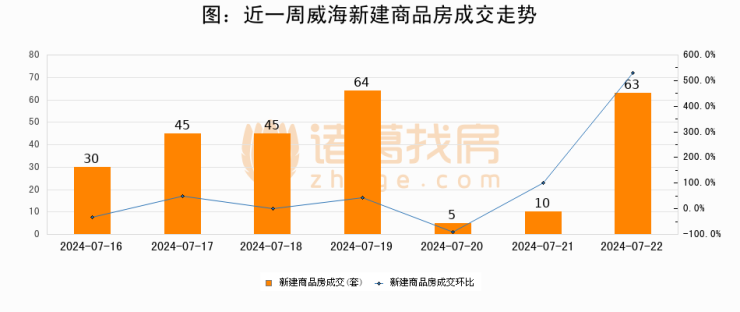 根据威海市住房和城乡建设局数据显示,2024年07月22日威海新建商品房成交63套,较昨日增加53套,环比上涨530%