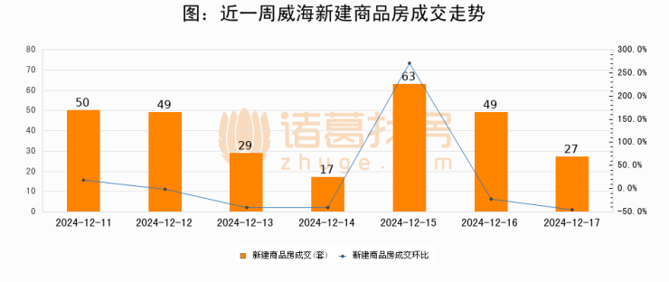 根据威海市住房和城乡建设局数据显示,2024年12月17日威海新建商品房成交27套,较昨日减少22套,环比下降44.9%。近一周威海新建商品房日均成交41套。12月17日单日成交27套,低于近一周平均水平34.1%。