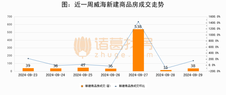 根据威海市住房和城乡建设局数据显示,2024年09月29日威海新建商品房成交38套,较昨日增加23套,环比上涨153.3%