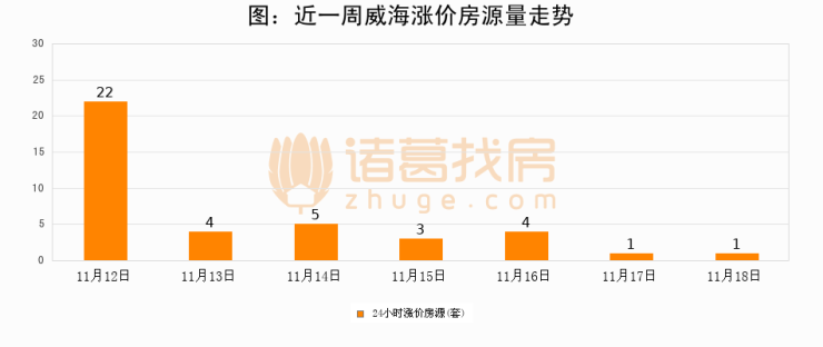 根据诸葛找房数据显示,威海24小时涨价房源量为1套,较11月17日持平。