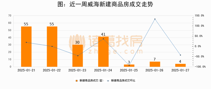 根据威海市住房和城乡建设局数据显示,2025年01月27日威海新建商品房成交4套,较昨日减少3套,环比下降42.9%。近一周威海新建商品房日均成交28套。01月27日单日成交4套,低于近一周平均水平85.7%。