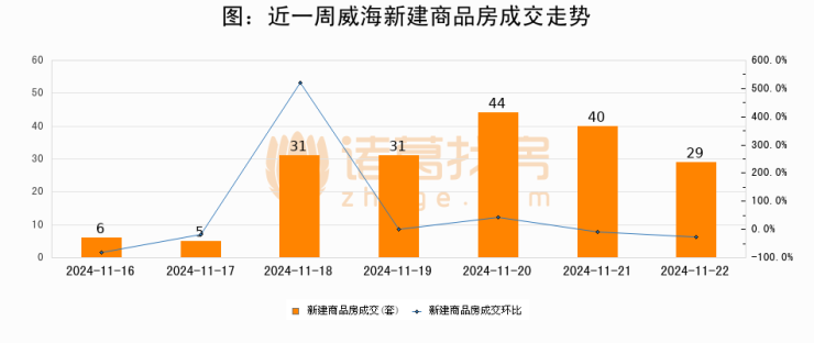 根据威海市住房和城乡建设局数据显示,2024年11月22日威海新建商品房成交29套,较昨日减少11套,环比下降27.5%