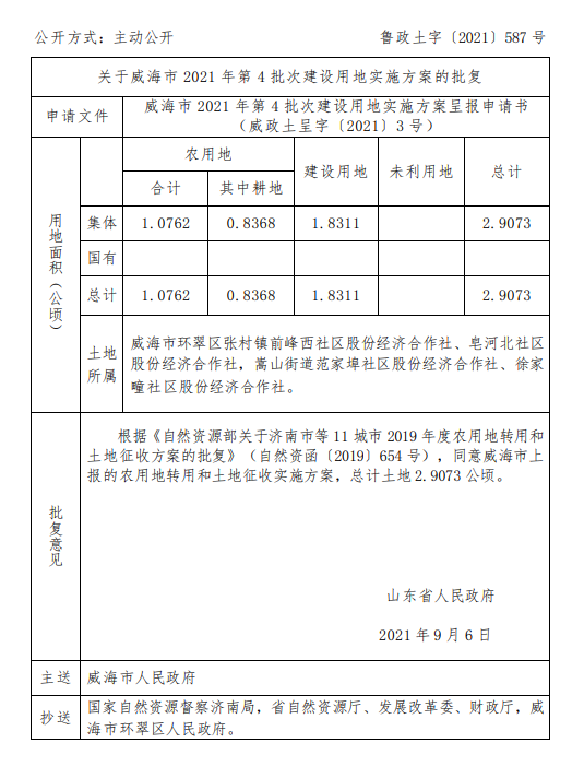 三:根据《自然资源部关于济南市等 11 城市 2019 年度农用地转用和 土地征收方案的批复》(自然资函〔2019〕654 号),同意威海市上 报的农用地转用和土地征收实施方案,总计土地 2.9073 公顷(其中集体用地合计1.0762公顷,建设用地1.8311公顷)。