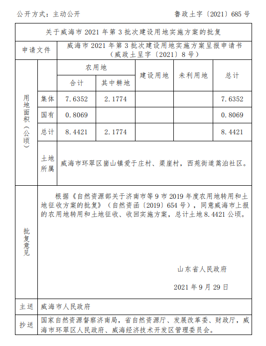 二:根据《自然资源部关于济南市等 9 市 2019 年度农用地转用和土 地征收方案的批复》(自然资函〔2019〕654 号),同意威海市上报 的农用地转用和土地征收、收回实施方案,总计土地 8.4421 公顷(其中集体用地7.6352公顷、国有用地0.8069公顷)。