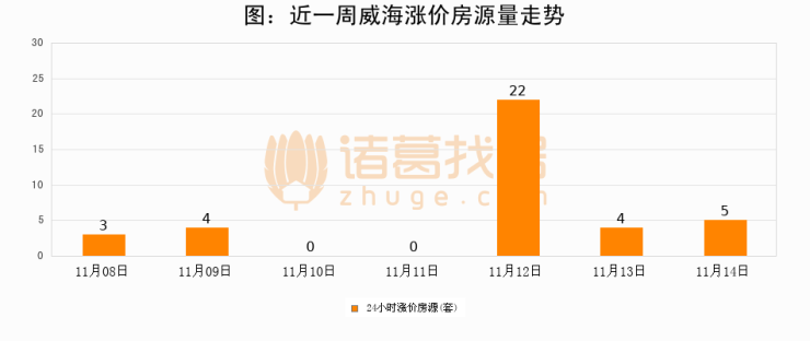 根据诸葛找房数据显示,威海24小时涨价房源量为5套,较11月13日增加1套,环比上涨25%。与此同时,涨价房源占比小幅扩大,业主信心有所提升。
