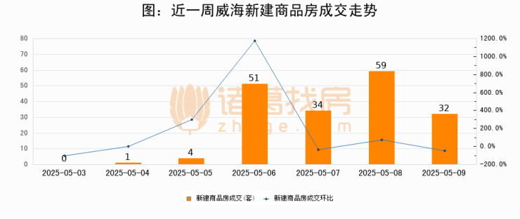 根据威海市住房和城乡建设局数据显示,2025年05月09日威海新建商品房成交32套,较昨日减少27套,环比下降45.8%