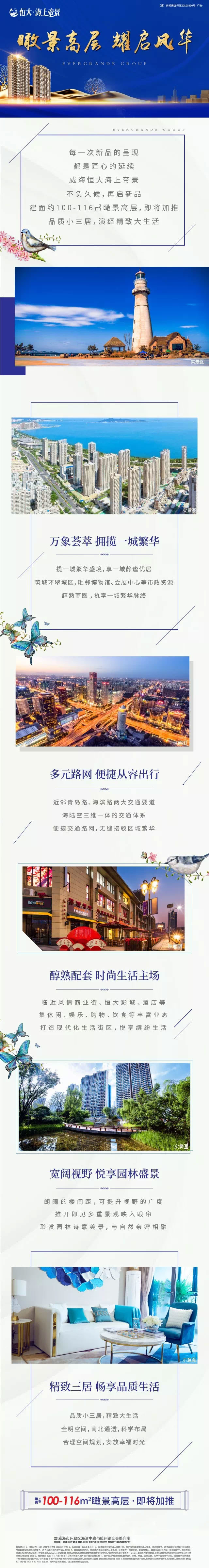 风险提示:1、预售证号:(威)房开证字第20190390 号;2、标准地名:海上帝景小区;3、本项目注册名为海上帝景小区,推广名为威海恒大海上帝景,商品房楼号、房号由政府有关部门初步确定,项目最终名称及商品房楼号、房号以政府相关文件确认为准;4、本资料相关内容、图片是对项目所做的示意表现,仅供参考,楼盘规划、配套等情况,最终以政府有关部门批准的文件、图则为准;经政府批准的详细规划已在楼盘销售现场公示,敬请查看;后续因规划设计方案调整导致信息变化的内容,我司将按照政府要求进行公示;5、本资料为要约邀请,买卖双方的权利及义务以双方签订的《商品房买卖合同》为准;6、恒大集团2019年7月由《财富》杂志评选进入世界500强企业排行榜;7、本广告对项目的周围道路规划、环境、交通、公共设施、各种产品及文字介绍,旨在提供相关信息,不意味着本公司对此作出了任何承诺;8、本广告相关面积段均为预估建筑面积,具体面积以签署《商品房买卖合同》为准;9、本文部分配图来源于网络,相关版权归原作者所有,如有侵权,请联系我们删除;10、本广告2019年11月16日启用,相关内容如有更新,请以较新资料内容为准。
