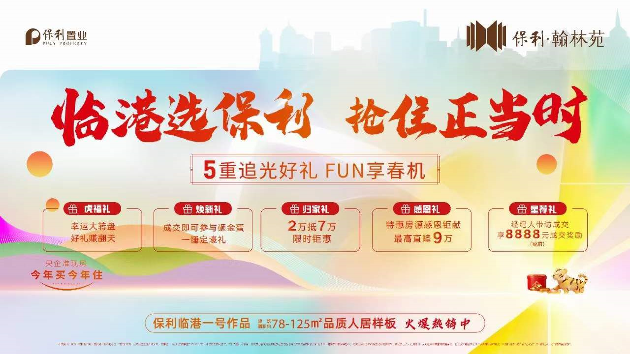 保利翰林苑主推建面约78—125平方米,现项目推出5重追光好礼,幸运大转盘,成交砸金蛋,2万抵7万限时钜惠,特惠房源较高直降9万,经纪人带访成交享8888元(税前)成交奖励,详情以售楼处为准。