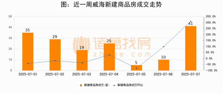 根据威海市住房和城乡建设局数据显示,2025年07月07日威海新建商品房成交41套,较昨日增加31套,环比上涨310%