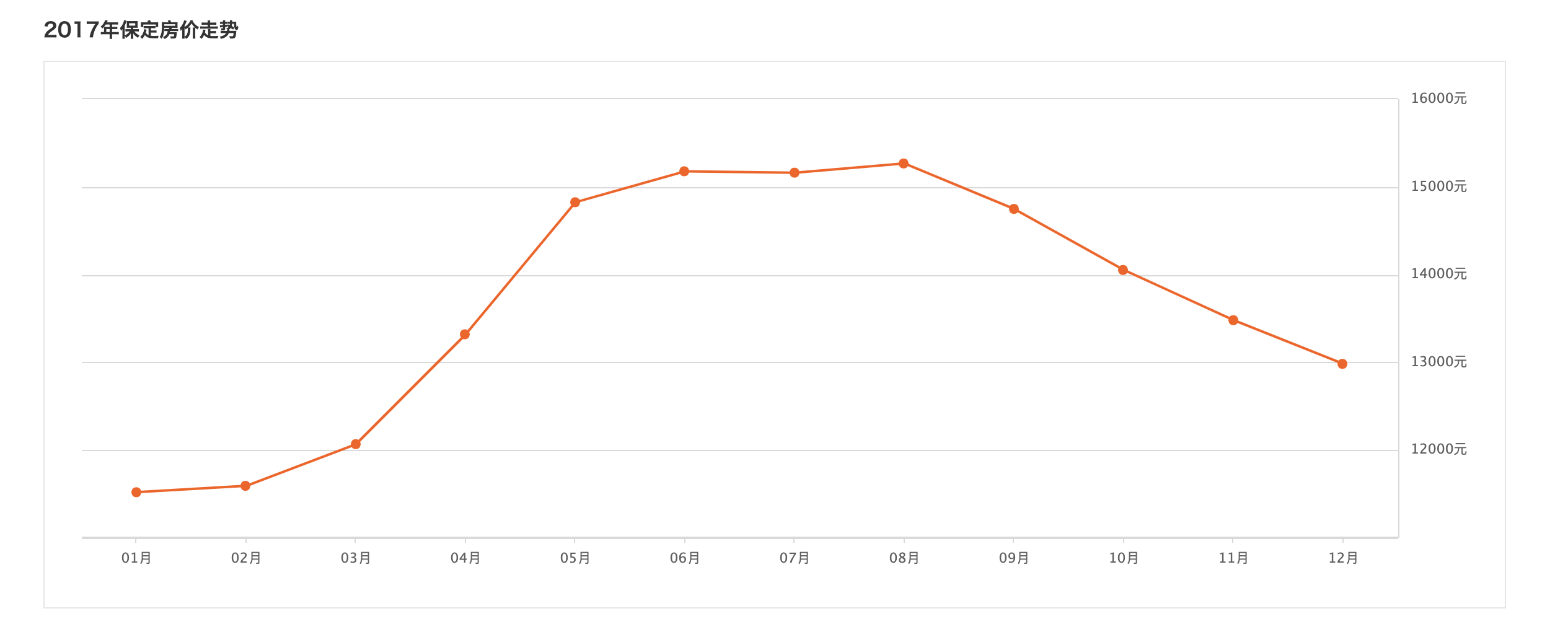 根据58同城安居客数据,保定房价在2016年中有了明显上升,房价从当年1月的7268元/平方米一路上涨至12月的10151元/平方米,其后到了2017年7月间,保定房价突破了15000元/平方米。