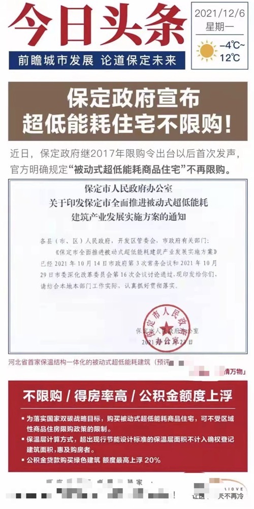更重要的是这么几句,“购买被动式超低能耗商品住宅,可不受区域性商品住房限购政策的限制”,这就意味着在保定的某些特定项目,已经不存在限购了。