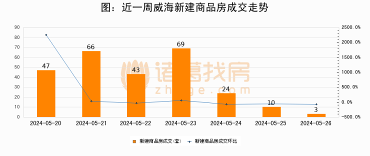 根据威海市住房和城乡建设局数据显示,2024年05月26日威海新建商品房成交3套,较昨日减少7套,环比下降70%