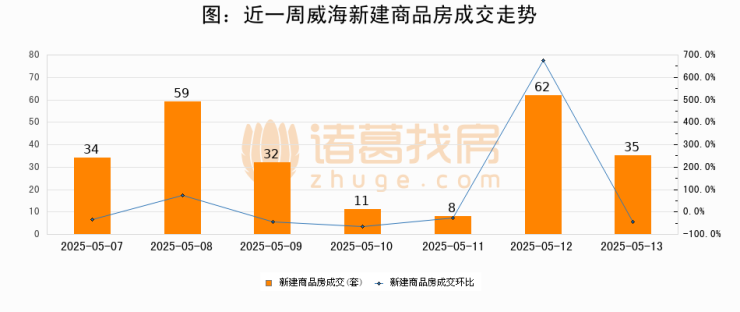 根据威海市住房和城乡建设局数据显示,2025年05月13日威海新建商品房成交35套,较昨日减少27套,环比下降43.5%