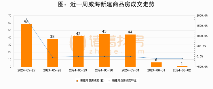 根据威海市住房和城乡建设局数据显示,2024年06月02日威海新建商品房成交1套,较昨日减少5套,环比下降83.3%