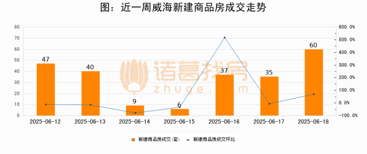 根据威海市住房和城乡建设局数据显示,2025年06月18日威海新建商品房成交60套,较昨日增加25套,环比上涨71.4%