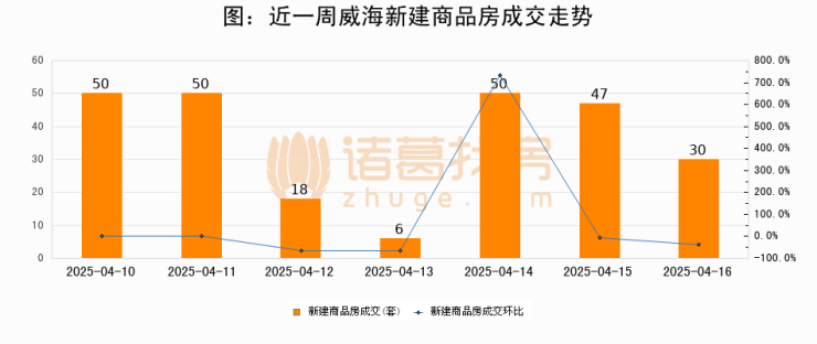 根据威海市住房和城乡建设局数据显示,2025年04月16日威海新建商品房成交30套,较昨日减少17套,环比下降36.2%。近一周威海新建商品房日均成交36套。04月16日单日成交30套,低于近一周平均水平16.7%。