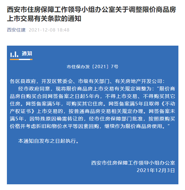12月8日,西安市住房保障工作领导小组办公室对外发布了关于调整限价商品房上市交易有关条款的通知,对限价商品房上市交易等有关规定进行了调整。