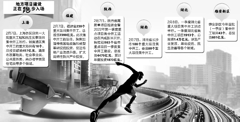 据记者不完全统计,截至2月9日,湖北省、福建省、陕西省等地相继举行省级重点建设项目集中开工仪式。而在上海、雄安新区、广东、云南、湖南等地下属的区和地级市也有一大批重大工程在节后集中开工签约。