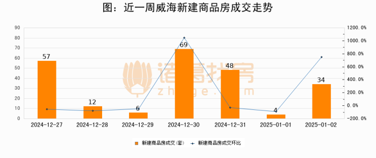 根据威海市住房和城乡建设局数据显示,2025年01月02日威海新建商品房成交34套,较昨日增加30套,环比上涨750%