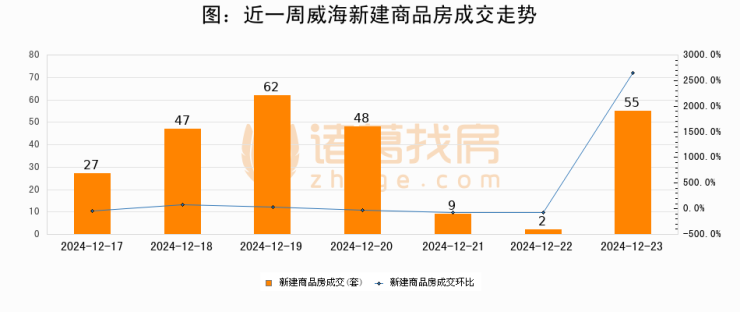 根据威海市住房和城乡建设局数据显示,2024年12月23日威海新建商品房成交55套,较昨日增加53套,环比上涨2650%