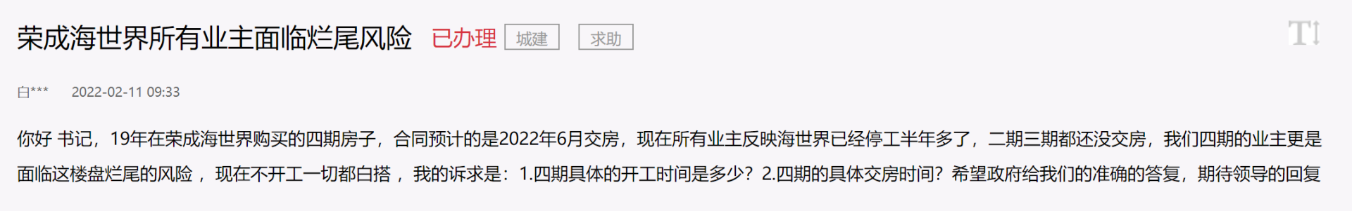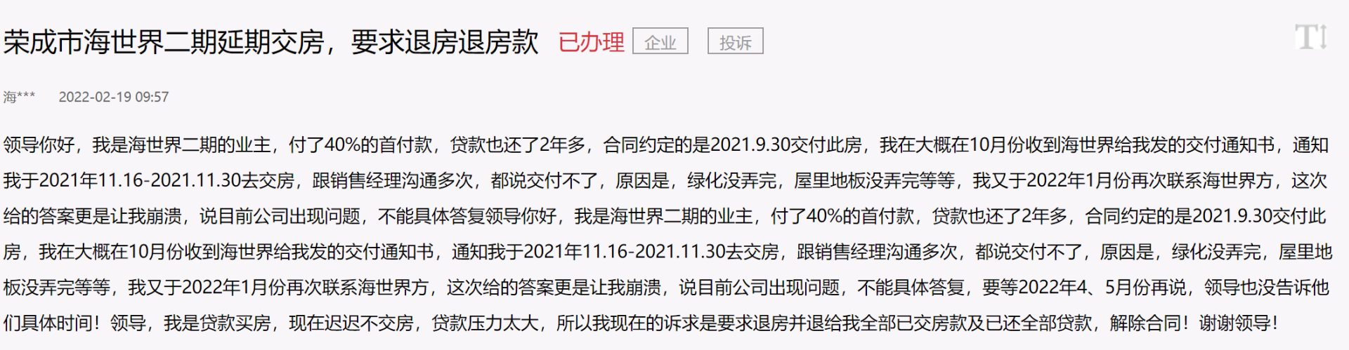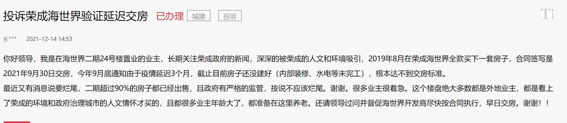 但不少网友爆料,荣成海世界二期和三期,开发商延期交付,且无延期交付解决方案,已收房房源不符合收房要求,暂时无法进行综合验收。