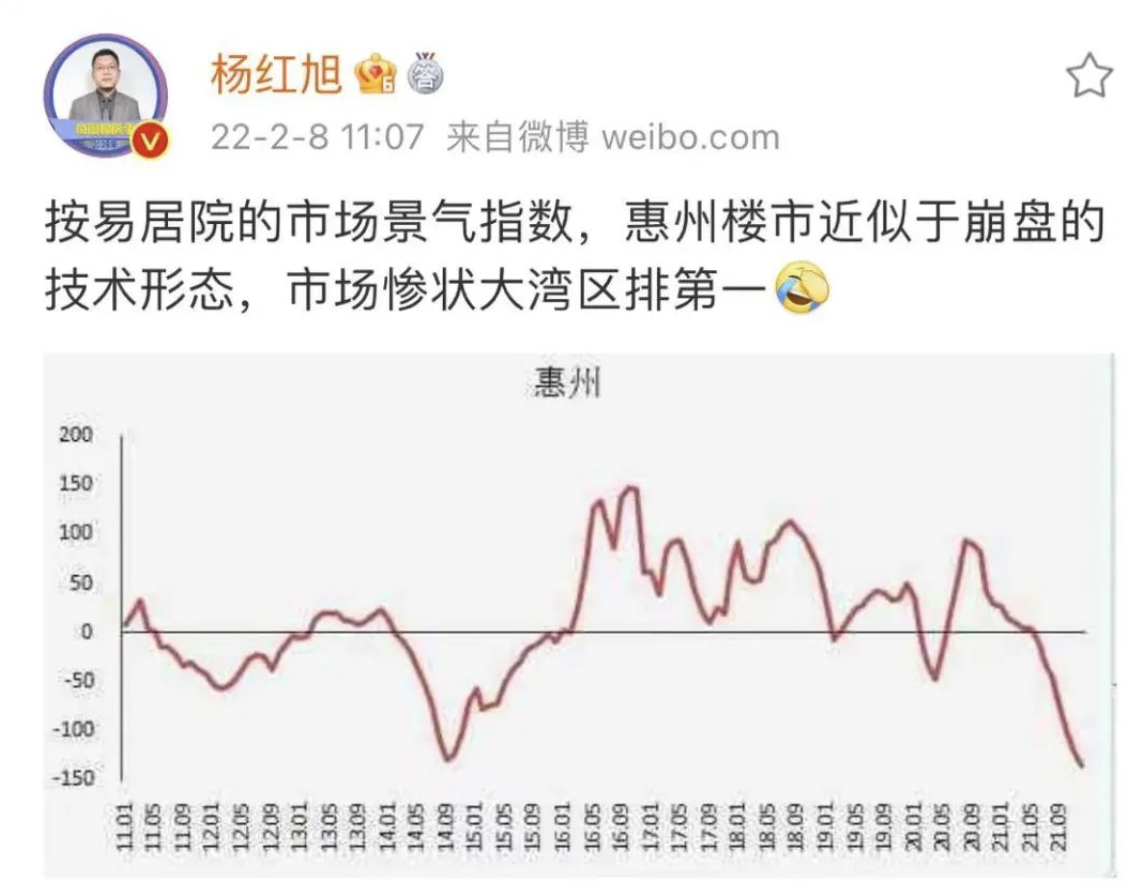 而这几天,易居研究院一张关于惠州楼市市场景气度近10年最差的折线图在网上盛传,易居研究院院长杨红旭甚至直言惠州楼市技术形态近似崩盘,市场惨状大湾区排排名前列。