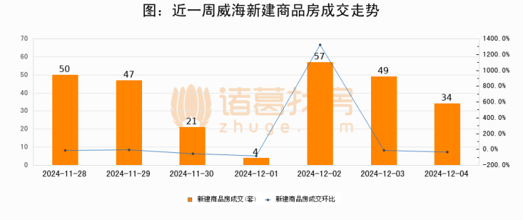 根据威海市住房和城乡建设局数据显示,2024年12月04日威海新建商品房成交34套,较昨日减少15套,环比下降30.6%。近一周威海新建商品房日均成交38套。12月04日单日成交34套,低于近一周平均水平10.5%。