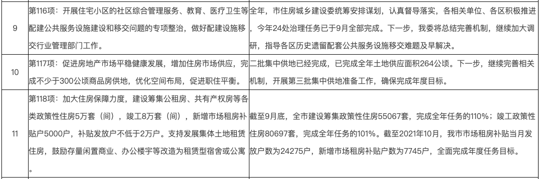 在保障性住房建设方面,截至9月底,全市建设筹集政策性住房55067套,完成全年任务的110%;竣工政策性住房80697套,完成全年任务的101%。截至2021年10月,北京市场租房补贴当月发放户数为24275户,新增市场租房补贴户数为7745户,全面完成年度任务目标。