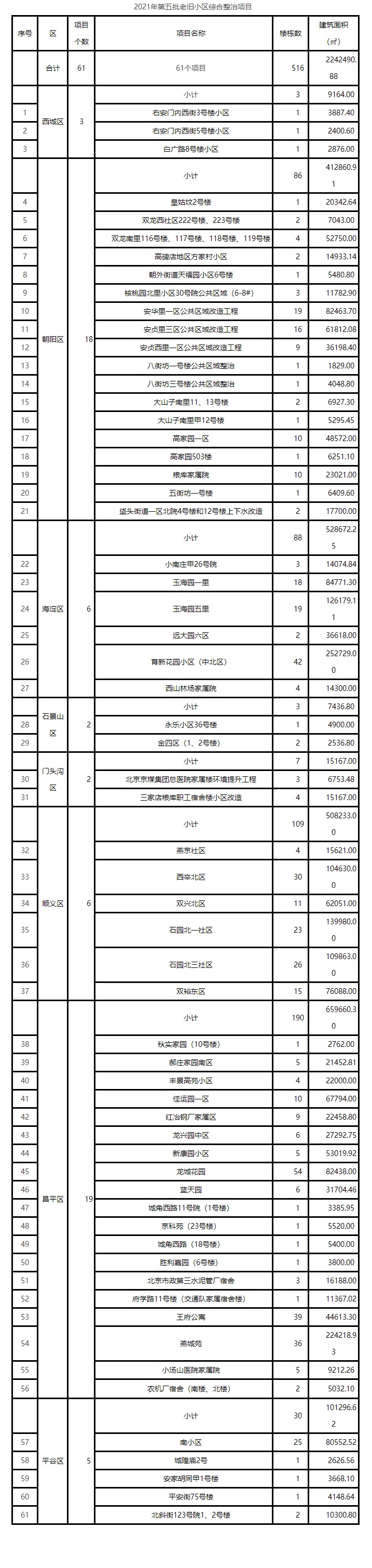 此次纳入名单的老旧小区综合整治项目共涉及西城、朝阳、海淀、石景山、门头沟、顺义、昌平、平谷等8个区的共计61个项目,涉及改造楼栋数516栋、改造总建筑面积约224.25万平方米。