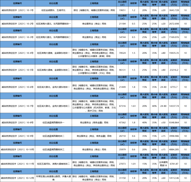 11月19日,威海市自然资源和规划局决定在威海市公共资源交易网公开挂牌出让12宗国有建设用地使用权,其中11宗土地位于经区,1宗土地位于环翠区。总出让面积超52.7万平方米,起始价为11.6亿元,详情如下: