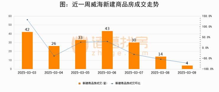 根据威海市住房和城乡建设局数据显示,2025年03月09日威海新建商品房成交4套,较昨日减少10套,环比下降71.4%。近一周威海新建商品房日均成交28套。03月09日单日成交4套,低于近一周平均水平85.7%。