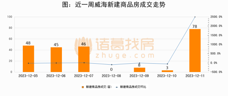 根据威海市住房和城乡建设局数据显示,2023年12月11日威海新建商品房成交78套,较昨日增加75套,环比上涨2500%