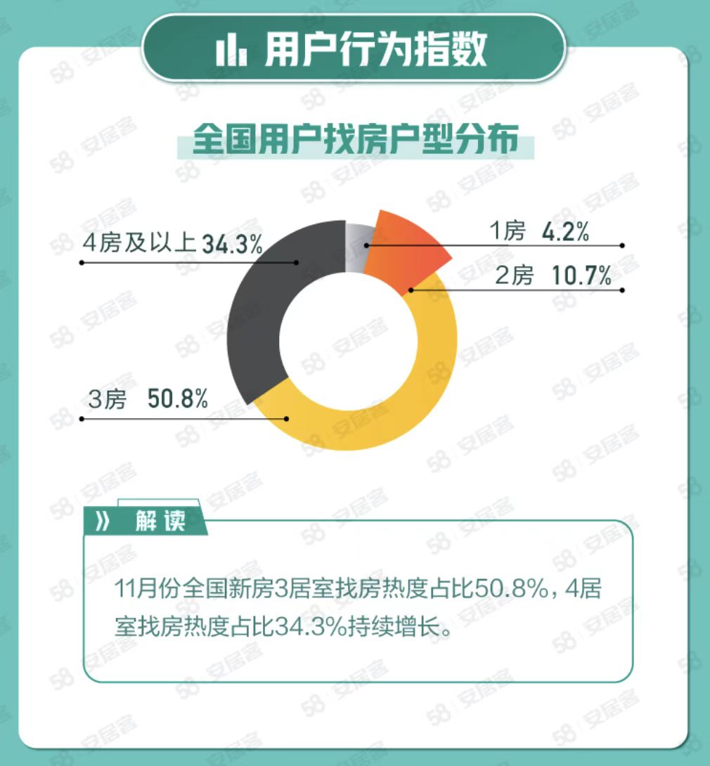 58安居客房产研究院统计数据显示,11月份全国新房3居室找房热度占比50.8%,4居室及以上找房热度持续增长,占比达到34.3%。该月购房者信心指数为99.2,环比上涨3.4%,52.4%的购房者认为政策会继续调控抑制房价上涨;33.9%的购房者认为今年房价与去年相比基本持平。