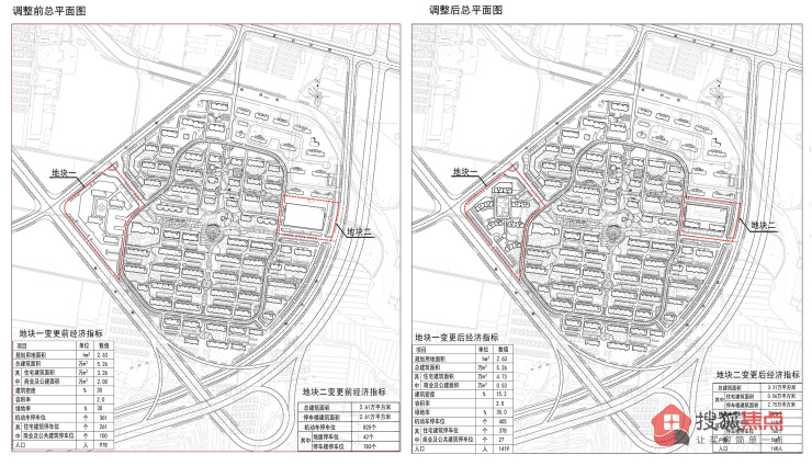 地块一调整后指标为:总建筑面积5.26万㎡(住宅建筑面积4.73万㎡,商业及公建面积0.53万㎡),建筑密度15.2%,绿地率35%,容积率2.0,机动车停车位405个(住宅建筑停车位378个,商业及公共建筑停车位27个),规划人口1419人。
