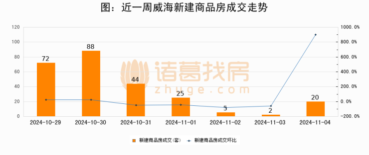 根据威海市住房和城乡建设局数据显示,2024年11月04日威海新建商品房成交20套,较昨日增加18套,环比上涨900%
