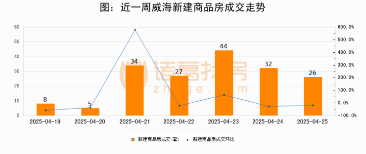根据威海市住房和城乡建设局数据显示,2025年04月25日威海新建商品房成交26套,较昨日减少6套,环比下降18.8%
