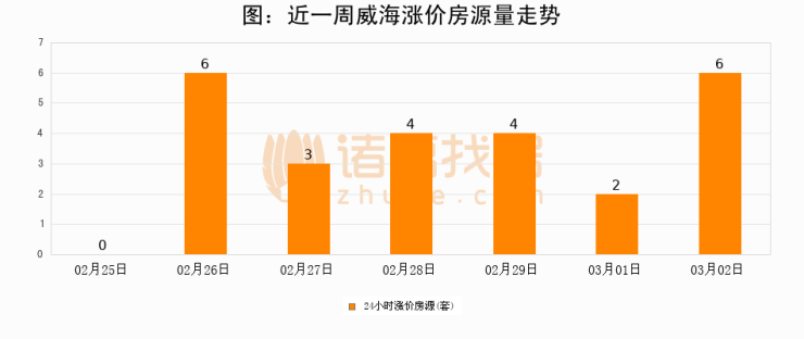 根据诸葛找房数据显示,威海24小时涨价房源量为6套,较03月01日增加4套,环比上涨200%。与此同时,涨价房源占比小幅扩大,业主信心有所提升。