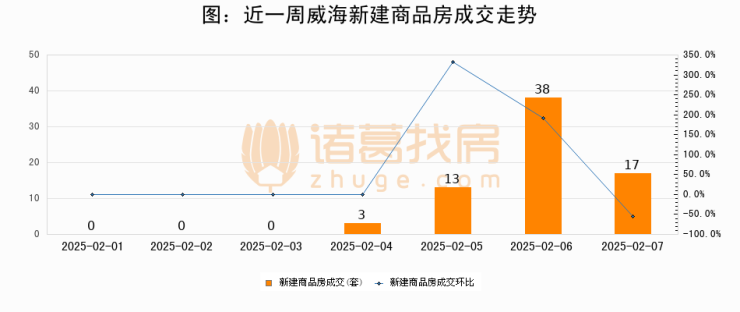根据威海市住房和城乡建设局数据显示,2025年02月07日威海新建商品房成交17套,较昨日减少21套,环比下降55.3%