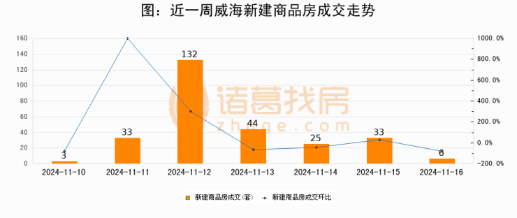根据威海市住房和城乡建设局数据显示,2024年11月16日威海新建商品房成交6套,较昨日减少27套,环比下降81.8%