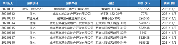 搜狐焦点威海站数据统计中心统计,11月1日至11月11日,威海市住房和城乡建设局更新了8张预售证,其中住宅入市面积为3.47万㎡,商业商务入市面积近1.9万㎡。中海海嘉(地产)有限公司、威海实地房地产开发有限公司、威海国兴置业有限公司各1张,威海五洲基业房地产开发有限公司占5张。涉及中海金线鼎、新基业·当代阅ΜΟΜΛ、财信保利名著、五洲太阳城4个项目。