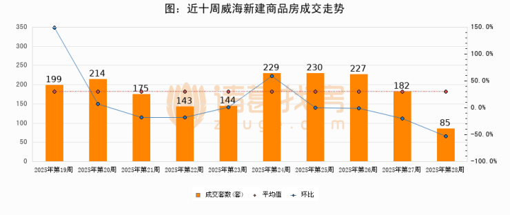 进入2025年第28周(07月07日-07月13日),威海新建商品房成交85套,较上周减少97套,环比下降53.3%